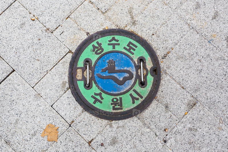 Зеленый канализационный люк на улице в центре Сеула
