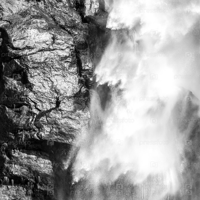 Абстрактное, черно-белое изображение воды и камня. Фрагмент водопада, естественный текстурированный фон