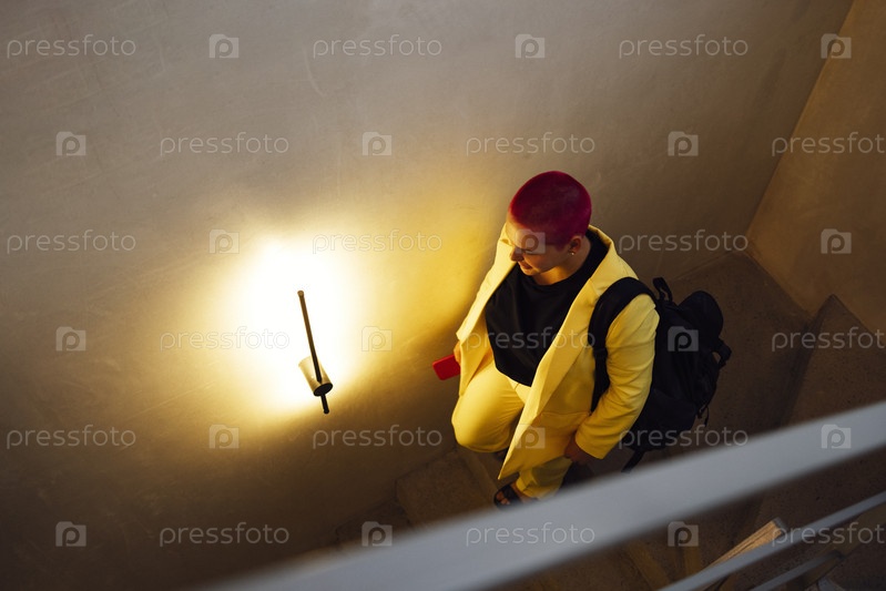 Молодая женщина с помощью мобильного телефона на лестнице. Девушка с коротко выбритыми волосами