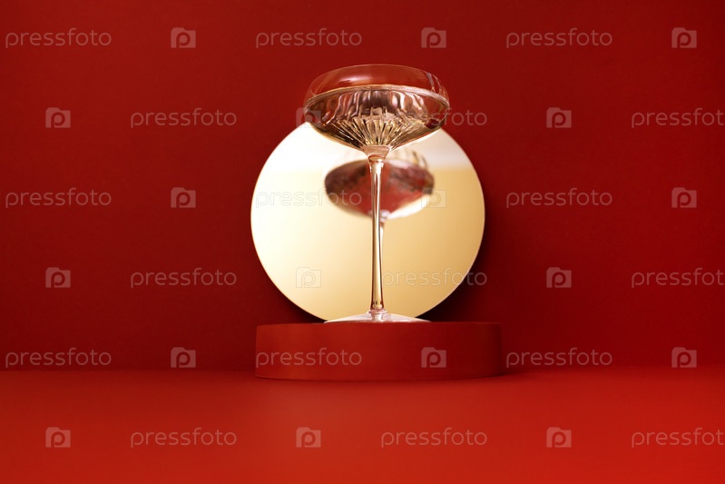 Ретро бокал игристого шампанского отражается в зеркале. Праздничная концепция