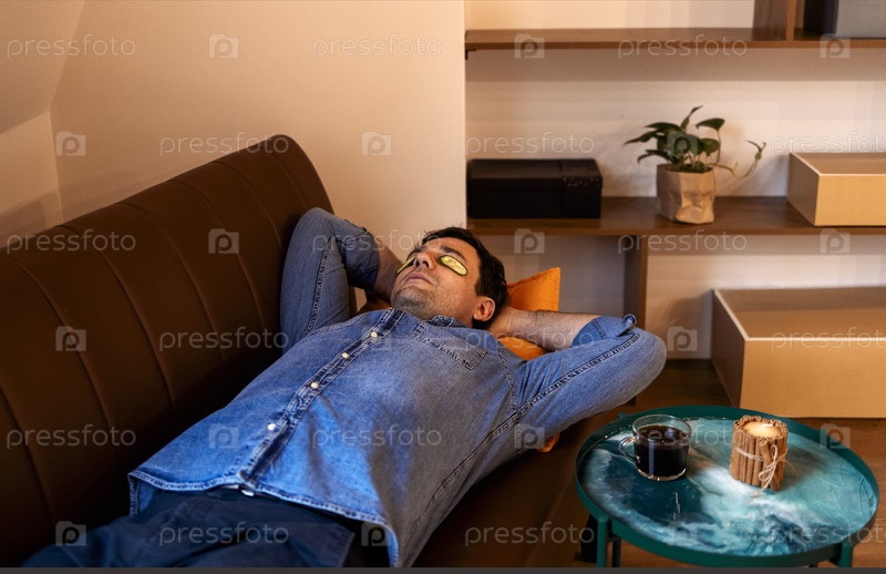 Расслабленный мужчина в повседневной одежде и маске из огурца на лице