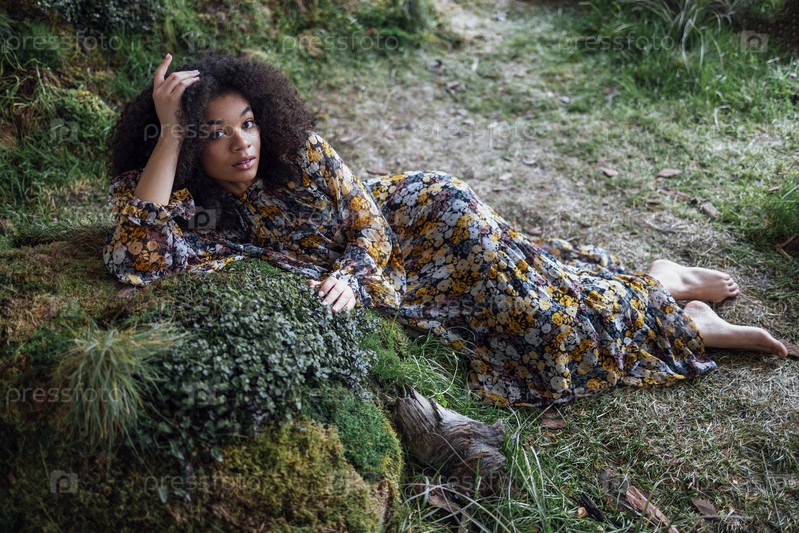 Мода и красота снимают очаровательную девушку смешанной расы в длинном платье