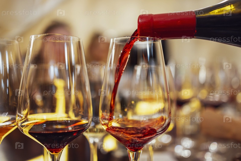 Стеклянные бокалы, расставленные рядами на столе во время процедуры дегустации вин в ресторане