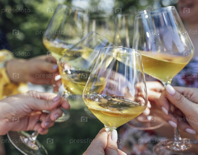 Праздничный тост с игристым вином. Женские руки держат бокалы с шампанским