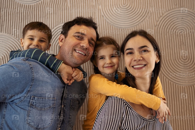 Счастливые родители с сыном и дочерью позируют в помещении