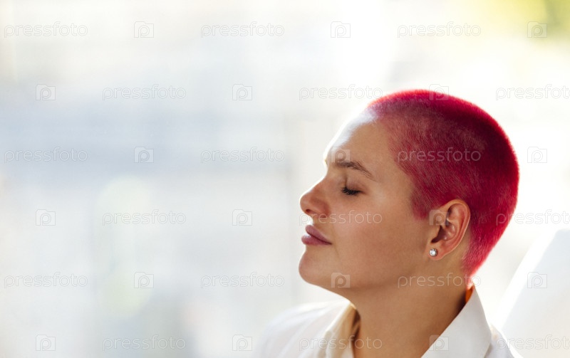 Красивая расслабленная женщина в легкой одежде и с рыжими волосами