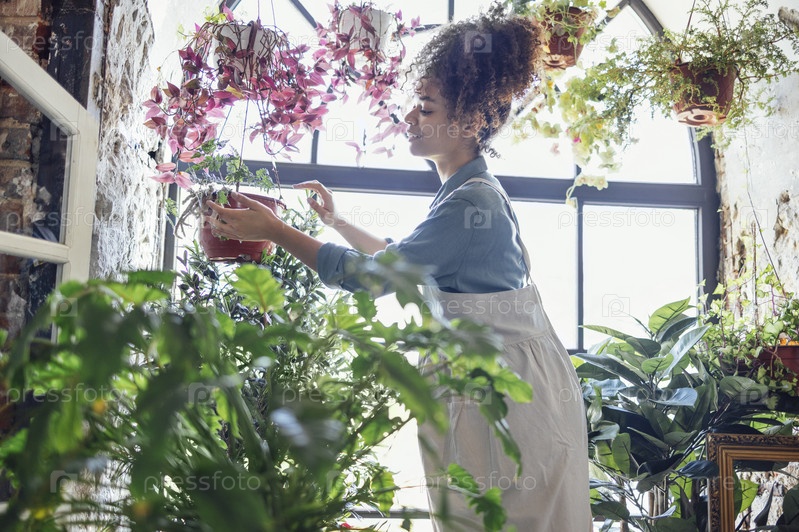 Молодая афроамериканка, любительница растений, ухаживает за комнатным растением