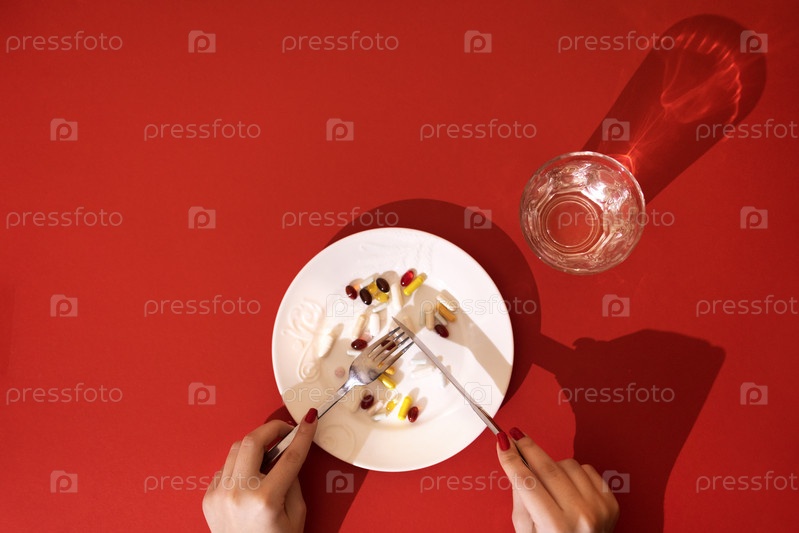 Таблетки, пилюли и капсулы на белой фарфоровой тарелке. Стол накрыт тарелкой