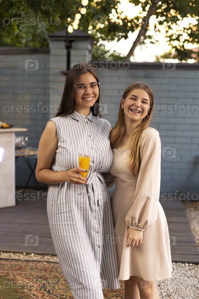 Подруги вместе на вечеринке в саду. Молодые девушки веселятся в солнечный летний день