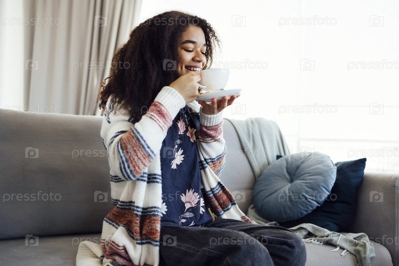 Веселая африканская американка отдыхает на диване с чашкой кофе, улыбаясь в камеру