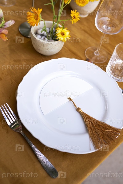 Свадебный стол для гостей, украшенный свечами, сервированный столовыми приборами и посудой и накрытый желтой скатертью