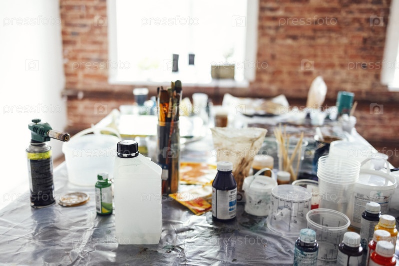 Ведра с краской, грязные стеклянные банки, кисти, краскопульт, растворители и другие художественные принадлежности