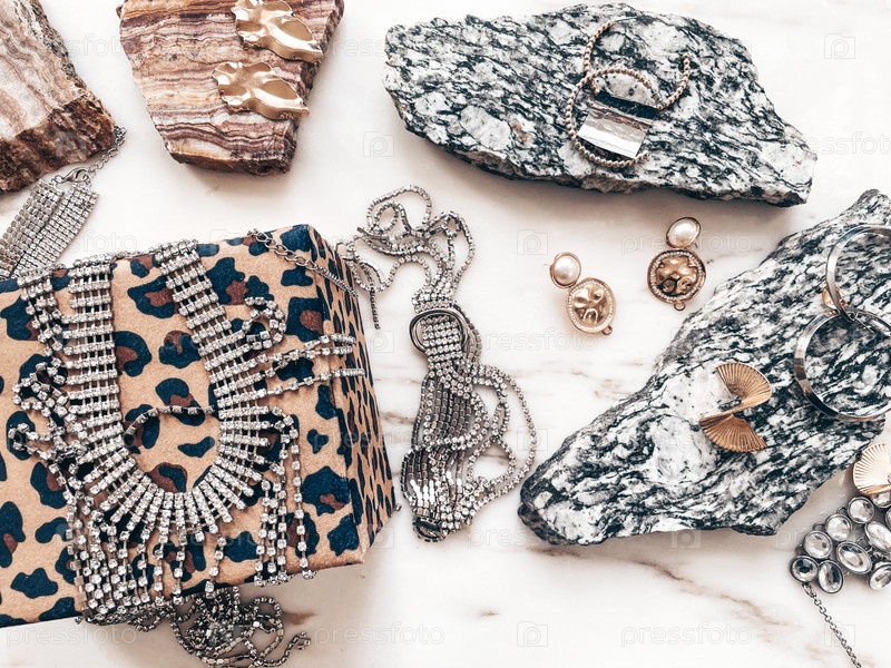 Украшения размещены на натуральных камнях и светлом фоне. Ожерелье, броши и серьги с драгоценными камнями на мраморном фоне