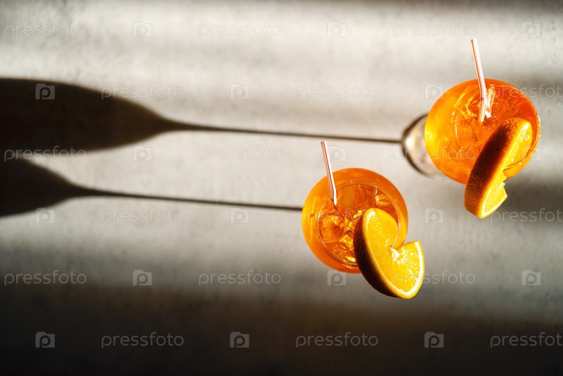 Оранжевый кусочек и коктейли aperol spritz на светлом фоне.Стеклянки с ледяной цитрусовой газированной минеральной водой и соломинкой