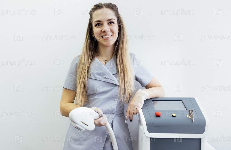 Красивая молодая женщина в специальной форме салона красоты и прозрачных перчатках стоит рядом с профессиональной машиной для фотоэпиляции