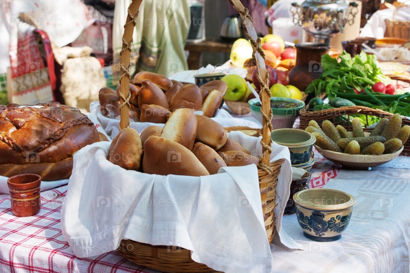 Пирожные, хлеб, огурцы, редис и яблоки на столе снаружи