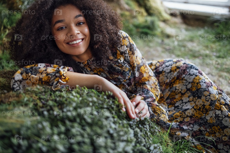 Мода и красота снимают очаровательную девушку смешанной расы в длинном платье