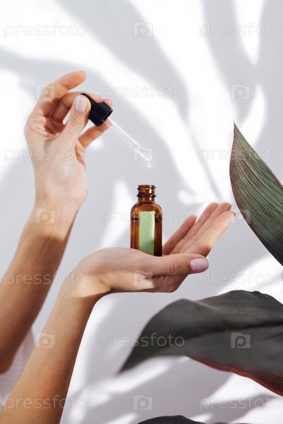 Женщина в белом халате заботится о своей коже и увлажняет лицо сывороткой