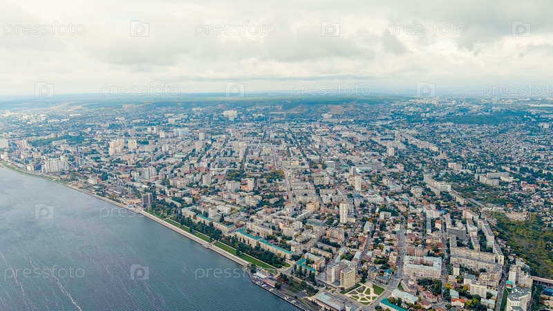 Саратов, Россия. Панорама города Саратова в пасмурную погоду, вид с воздуха