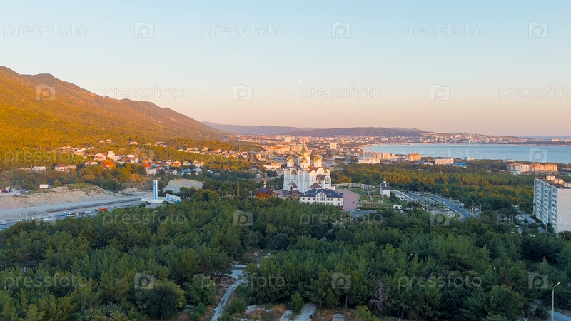 Геленджик, Россия. Собор Андрея Первозванного. Текст при въезде в город переводится как «Геленжик-городской курорт». Время заката, Вид с воздуха