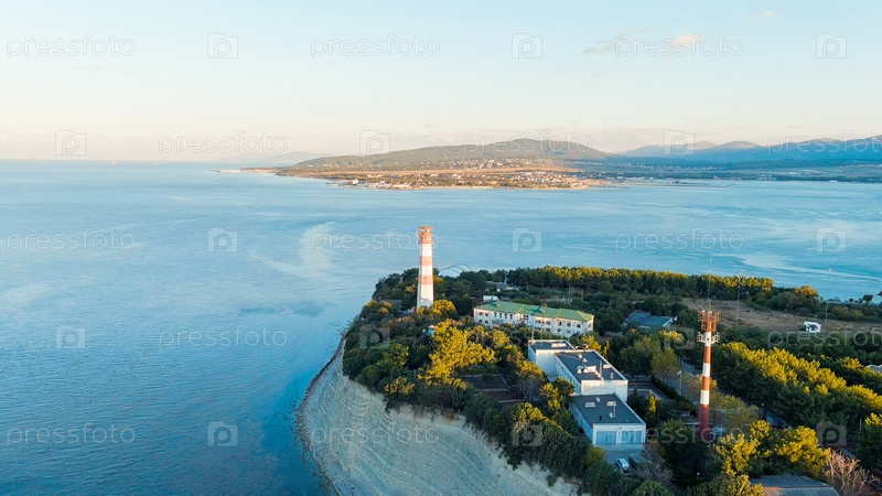 Геленджик, Россия. Маяк на берегу мыса Толстого. Геленджикская бухта, вид с воздуха