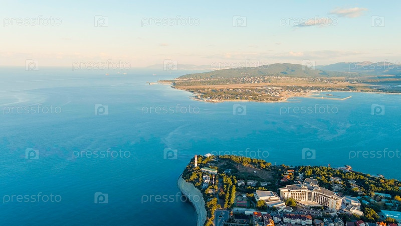 Геленджик, Россия. Маяк на берегу мыса Толстого. Геленджикская бухта, вид с воздуха
