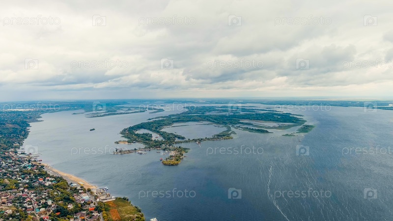 Саратов, Россия. Зеленый остров. Река Волга, вид с воздуха