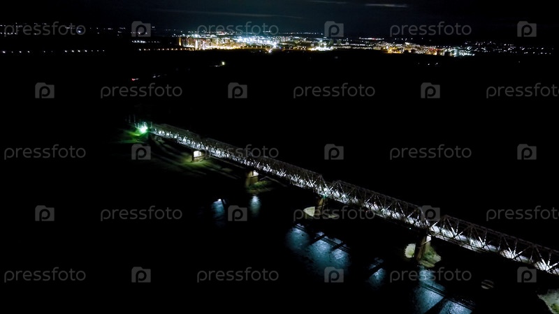 Уфа, Россия. Железнодорожный мост через реку Белую. Огни ночного города, вид с воздуха