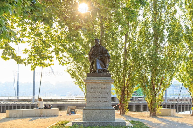Женева, Швейцария. Жан-Жак Руссо (1712 - 1778). Женевский философ, писатель и композитор 18 века. Скульптор Жан-Жак (Джеймс) Прадье (1790 - 1852)