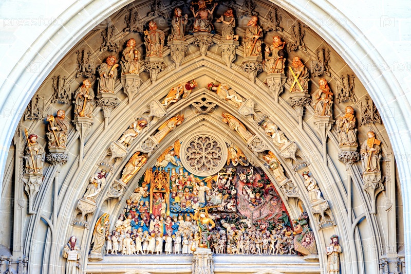 Портал над входом в Бернский собор (Berner Münster). украшен библейскими сценами из ада и рая. фигуры святых