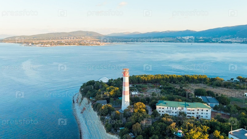 Геленджик, Россия. Маяк на берегу мыса Толстого. Геленджикская бухта, вид с воздуха