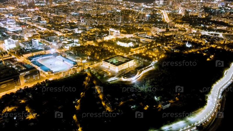 Уфа, Россия. Панорама центра города. Огни ночного города, вид с воздуха