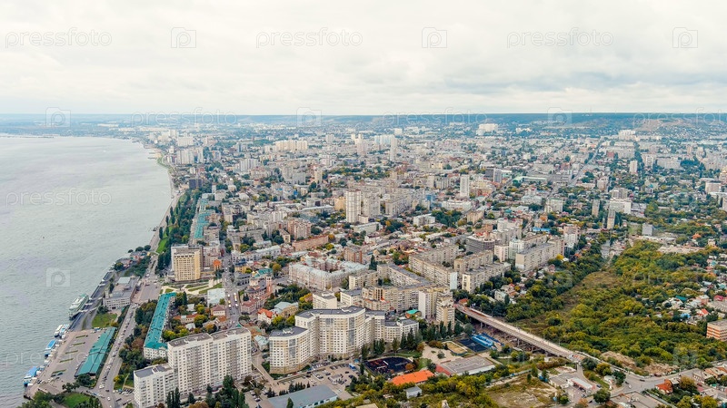 Саратов, Россия. Панорама города Саратова в пасмурную погоду, вид с воздуха