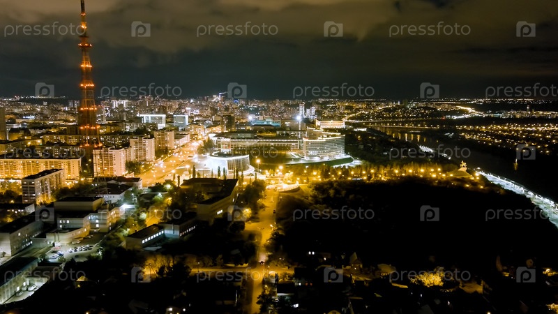 Уфа, Россия. Панорама центра города. Огни ночного города, вид с воздуха
