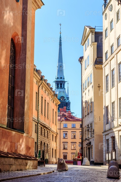 Стокгольм, Швеция. Улицы старого города. Историческая часть города Стокгольм. Вид на Никольскую церковь