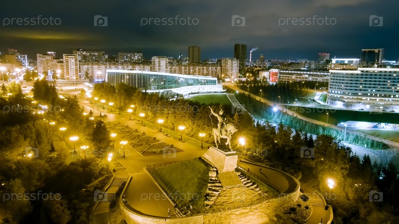 Уфа, Россия. Сквер имени Салавата Юлаева. Панорама города. Огни ночного города, вид с воздуха