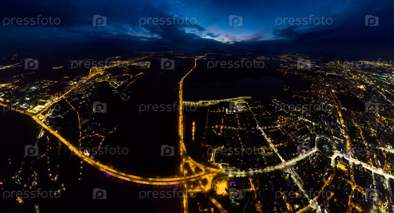 Калуга, Россия. Гагаринская развязка. Гагаринский мост. Ночной город. С высоты птичьего полета