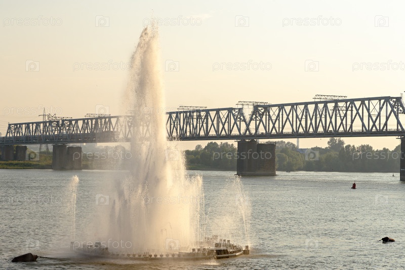 Россия, Новосибирск. По мосту проходят поезда. Железнодорожный мост через реку Обь. За фонтаном