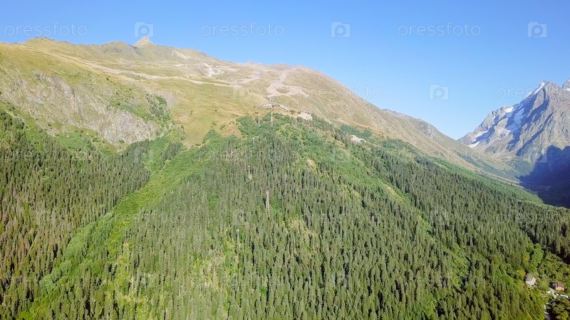 Вагон фуникулера. Полет в горах. Домбайская Поляна, Карачаево-Черкесия, Северный Кавказ. Россия