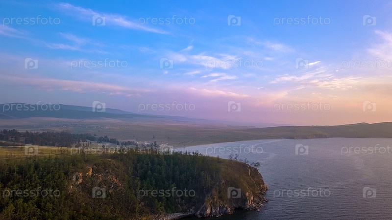 Россия, Озеро Байкал, Остров Ольхон, Закат над бухтой Малого моря, С дрона
