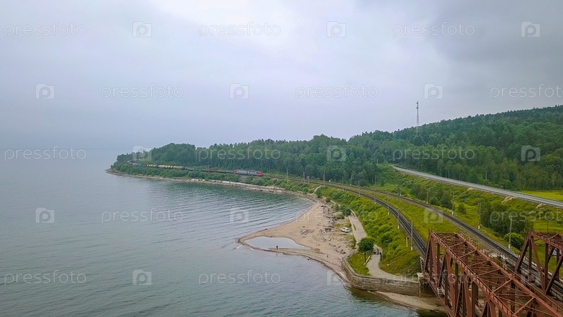 Транссибирская магистраль, побережье озера Байкал. Движение поездов по железному мосту через реку, впадающую в Байкал. Россия, с дрона
