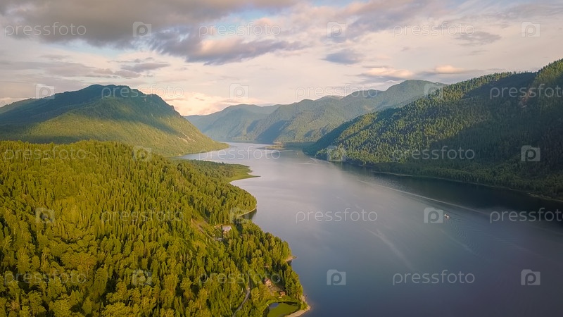 Панорамный вид на Телецкое озеро, Подъем к облакам. Россия, Алтай. Горы, покрытые лесами, От дрона