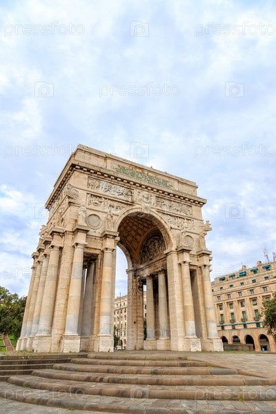 В Италии, Генуя. Арка Победы. Текст на английском языке: ГЕНУЯ. СИНОВИЯ, ПРОБЛЕЖНОСТЬ РОДОНЫ, ЗАГРАЗОВАТЕЛЬСТВА НА ЛЕСЕ И МОРЕ В ЦЕРКУ В Славе Веков. СПОРТА ОПИСАННАЯ. MCMXV-MCMXVIII
