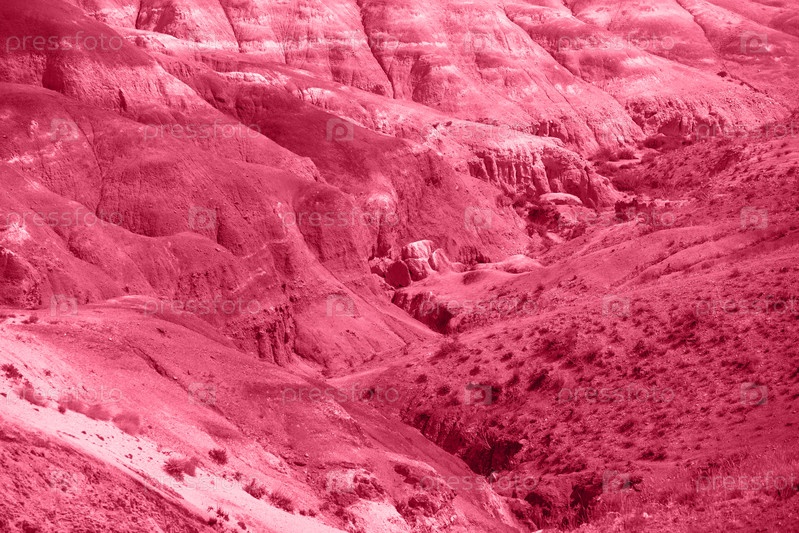 Модный цвет 2023 года: Viva Magenta в тонах с высоты птичьего полета на размытый ландшафт Алтайских гор