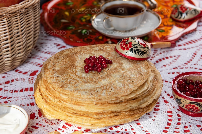 Русские блины с ягодами и сметаной на столе. Концепция фестиваля Масленица Масленица. Вид сверху. Плоская планировка