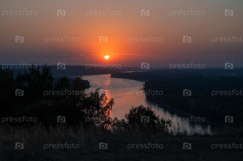 Вид на речной пейзаж в солнечный летний закат. Вид сверху на сибирскую реку Обь с высоты летнего заката