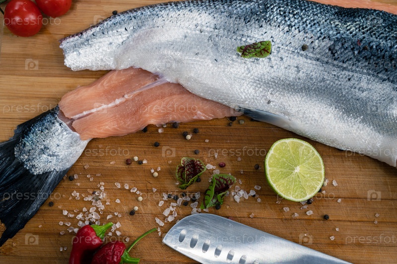 Свежий сырой лосось на деревянной доске кухни со специями и лаймом