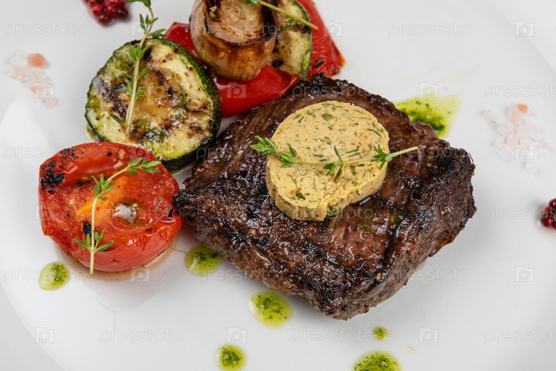 Стейк из корейки из черного ангуса на гриле с овощами на белой тарелке на черном деревянном фоне