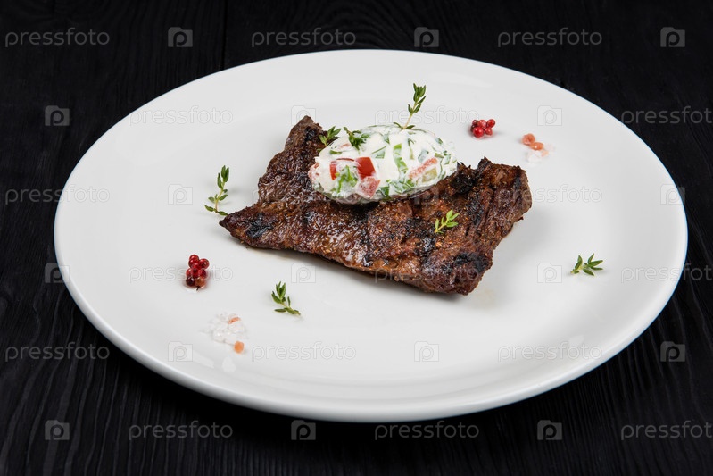 Стейк из говядины на гриле на тарелке с белым овощным соусом, украшенный травами и ягодами. Темный деревянный фон