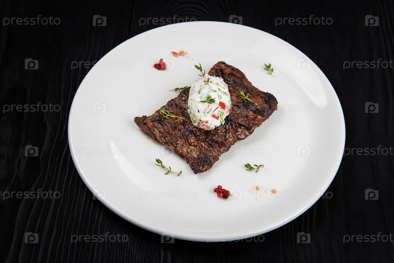 Стейк из говядины на гриле на тарелке с белым овощным соусом, украшенный травами и ягодами. Темный деревянный фон